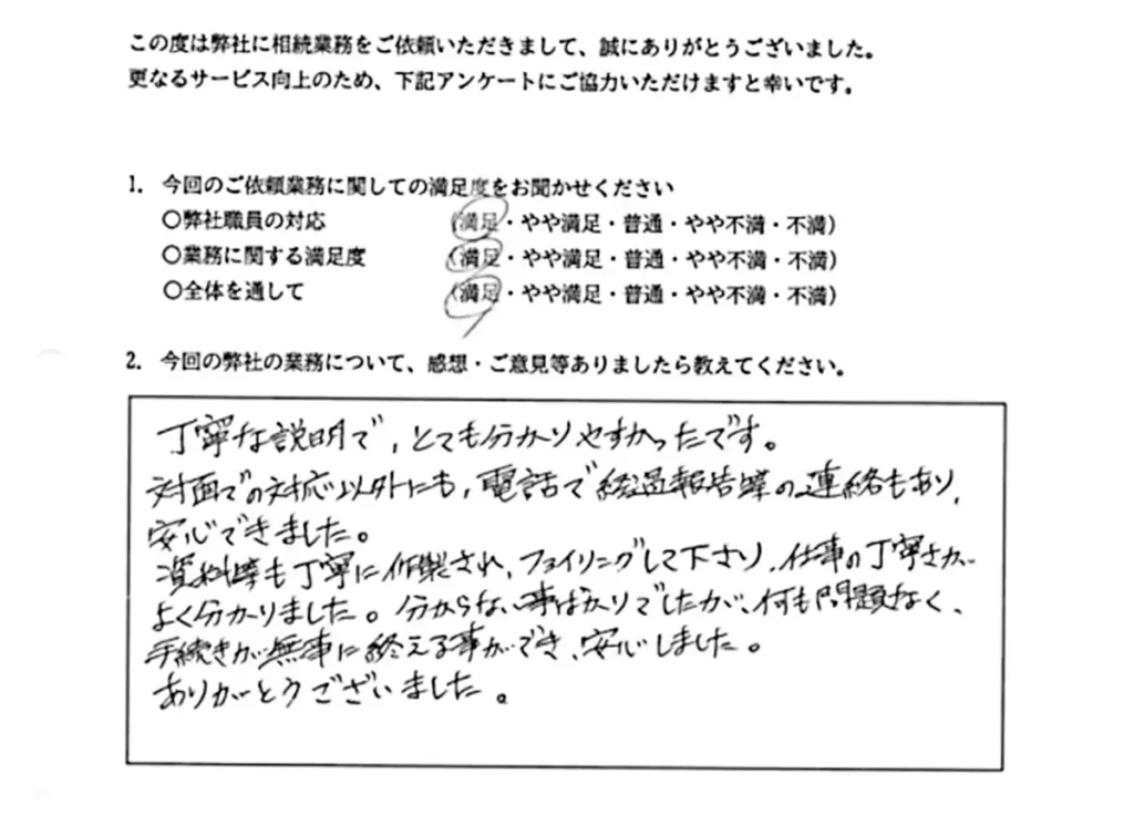 ご高齢となると役所や金融機関にて手続きすることもとてもご負担になり、なかなか手続きが進まないこともよくあります。税申告と相続手続きがすべて完了した段階で、一任できて本当にありがたかったとおっしゃっていただけました。